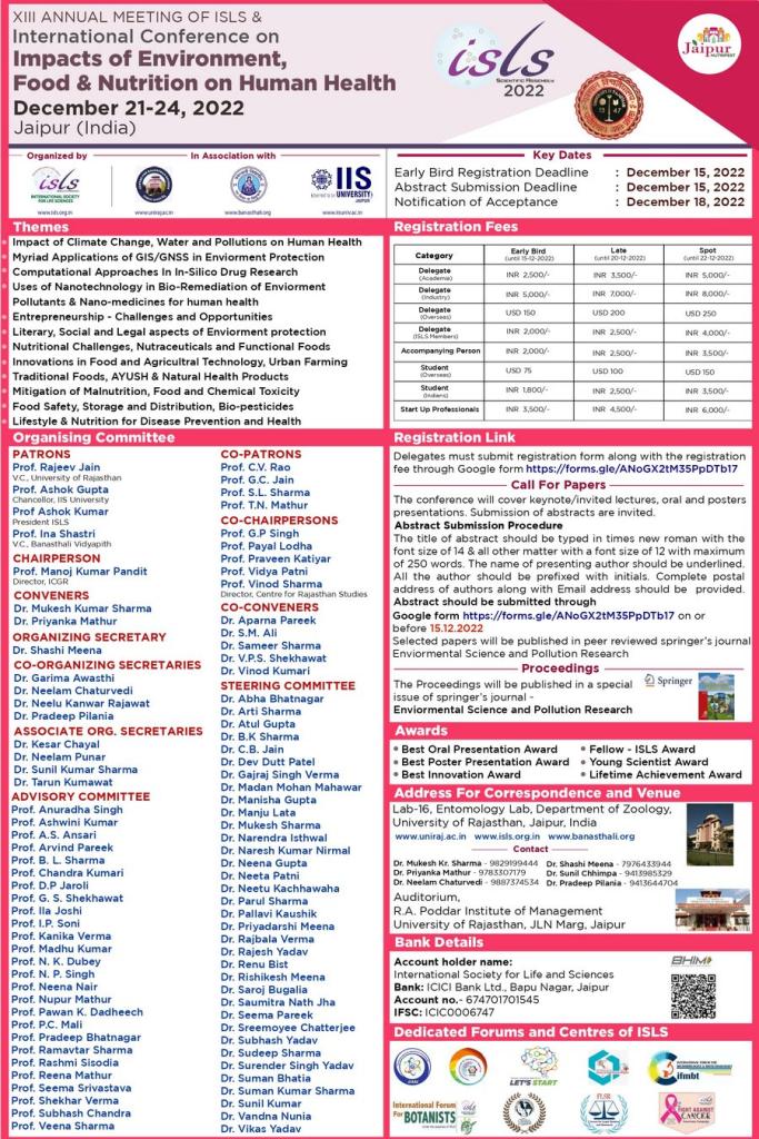 IIS (Deemed to be University) Jaipur in an academic partnership with (ISLS) International Society for Life Sciences in collaboration with University of Rajasthan, is organizing an International Conference on Impact of Environmental, Food and Nutrition on Human Health dated on 21-24th December 2022.